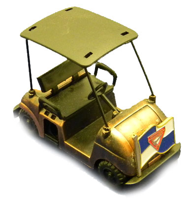 Brass rolling gold cart adorned with the pathfinder flag.